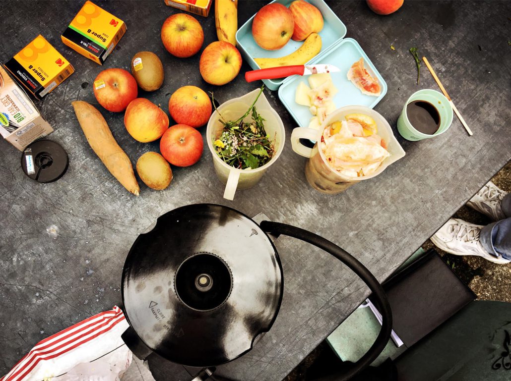 Du gehst raus und pflückst ein paar Blümchen, nimmst noch etwas Birkenrinde mit und die Kiwi- und Bananenschalen vom Frühstück, braust daraus eine Suppe, fügst Vitamin C und Waschsoda hinzu, rührst um, freust dich über die plötzliche chemische Reaktion, die leicht blubbert, die Suppe um 2 Grad wärmer macht und von rot zu grün-bläulich schiebt, schnüffelst vorsichtig an dem nie zuvor gerochenen Duft und hast das Gefühl, irgendwie ganz nah an (gesunder) Materie, Kunst und Wirklichkeit zu sein!